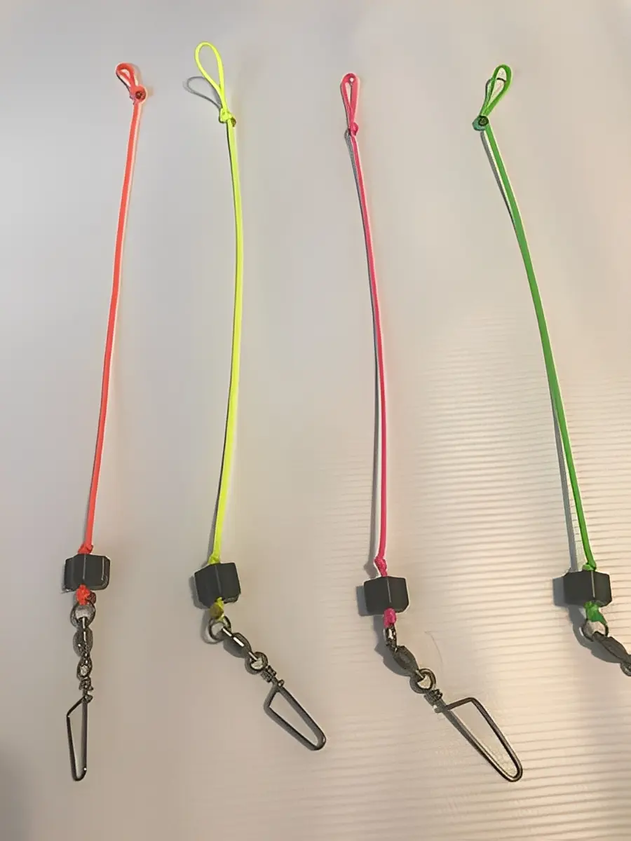 Leo Flasher anti drag release allows you to fight a fish with no drag from the flasher. When a fish strikes and hooks up the custom clip on the end of the flasher will pull off the flasher allowing you to fight the fish with no drag. Comes with a ball bearing swivel and everything rigged and ready.